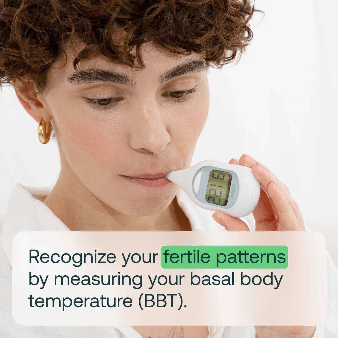 The Mira Basal Body thermometer helps you recognize your fertile patterns by measuring your basal body temperature (BBT). Use it to understand the rise and fall in your body's temperature during your menstrual cycle. Then, sync and save your data on the Mira App to get more insights!